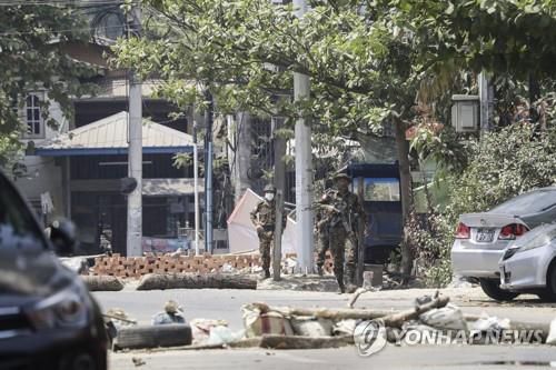 양곤의 철도노동자 집단 거주지 인근의 미얀마 군인들. 2021.3.10 |
