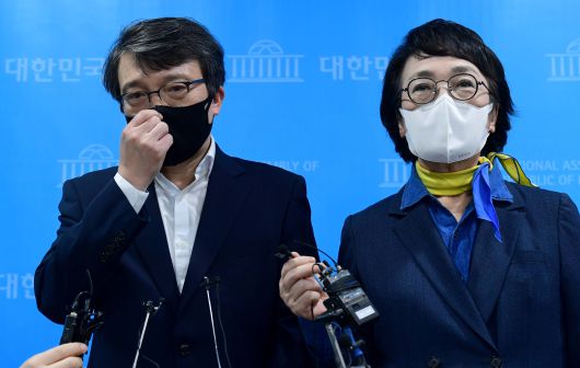 국회의원직을 사퇴한 열린민주당 김진애 서울시장 후보와 의원직 승계예정자인 김의겸 전 청와대 대변인이 지난 3일 국회 소통관에서 취재진과 인터뷰하고 있다. /연합뉴스 |