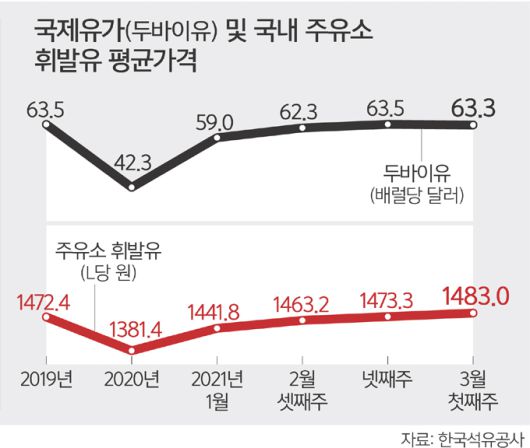 10일 한국석유공사에 따르면 지난주 전국 주유소 휘발유 평균 판매가격은 전주보다 9.7원 오른 L당 1483원으로 집계됐다. 지난해 11월 말부터 15주 연속 상승한 것이다. 이는 우리나라로 수입되는 두바이유의 가격이 오른 영향이다. 코로나19 여파로 지난해 4월 한때 배럴당 20달러 이하로 떨어졌던 두바이유 가격은 지난 8일 기준 68.32달러를 기록했다.