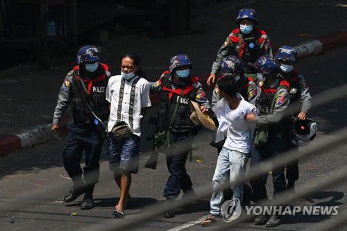 쿠데타 규탄 시위대 체포하는 미얀마 경찰 |
