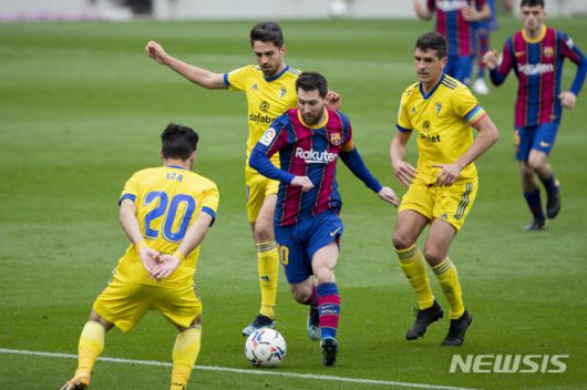 [바르셀로나=AP/뉴시스]바르셀로나의 리오넬 메시(가운데)가 21일(현지시간) 스페인 바르셀로나의 캄프누 경기장에서 열린 카디스와의 2020-21 라리가 24라운드 경기에 선발 출전해 경기하고 있다. 메시는 전반 32분 페널티킥 골을 넣으며 자신의 '라리가 506경기 출전'을 자축했으나 팀은 1-1 무승부를 기록했다. 2021.02.22. |