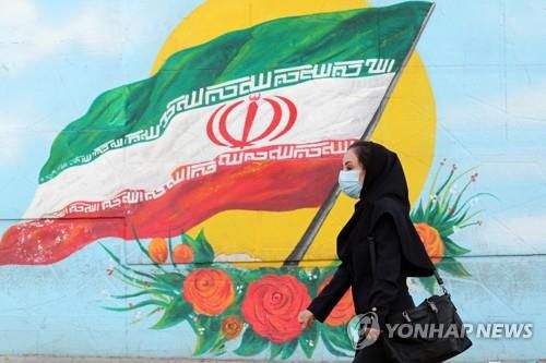 이란 국기를 그린 벽화 앞을 지나는 테헤란 시민 |
