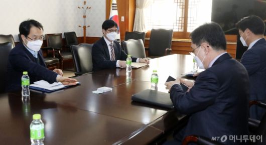 최승렬 국가수사본부 수사국장과 이종근 대검찰청 형사부장이 11일 오전 종로구 정부서울청사에서 열린 'LH 투기 의혹' 검·경 실무협의회에 참석해 회의 준비를 하고 있다.