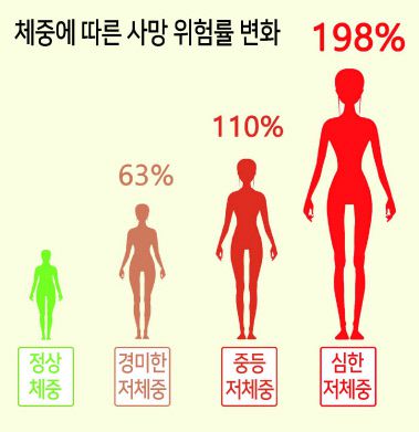 일반적으로 체중이 많이 나가면 제2형 당뇨병, 고혈압, 이상지혈증 발생이 2배 이상 증가한다. 심근경색, 뇌졸중과 같은 심뇌혈관질환 사망률도 높아진다고 알려졌다. 연구팀은 저체중 군을 경미한저체중(BMI 17~18.5), 중등저체중(BMI 16~17), 심한저체중(BMI 16 미만)으로 나눠 정상 군(BMI 18.5~23)과 비교했다. 저체중 정도가 더 심할수록 심근경색과 뇌졸중의 발생도 더 증가하는 것으로 나타났다. 특히, 심한저체중 군은 정상 군에 비해, 뇌졸중이 38%, 심근경색이 86% 더 많이 발생했다. 또한 저체중 정도가 더 심할수록 사망률도 높아졌다.
