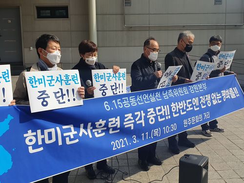 (원주=연합뉴스) 김영인 기자 = 6·15 공동선언실천남측위원회 강원본부는 11일 원주 문화의거리에서 기자회견을 하고 한미 연합 훈련 중단을 촉구했다.