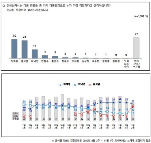 아울러 대통령감으로 적합한 인물이 없거나 해당 문항에 응답하지 않은 ‘태도 유보’는 27%였다.
