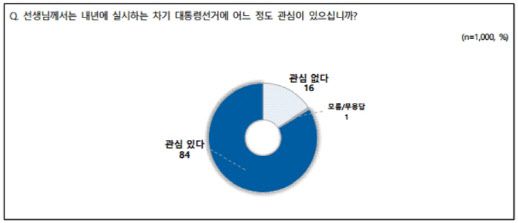 또 내년 3월 9일에 실시하는 제20대 대통령 선거에 대해 ‘관심 있다’고 답한 응답은 84%로 매우 높았으며 ‘관심 없다’는 의견은 16%였다.