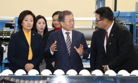 [천안=뉴시스]박영태 기자 =문재인 대통령이 22일 오전 천안 MEMC코리아 공장에서 300mm 웨이퍼 절삭 공정을 시찰하고 있다. 왼쪽부터 박영선 전 중소벤처기업부 장관, 문 대통령, 조찬래 MEMC코리아 사장. 2019.11.22. since1999@newsis.com |