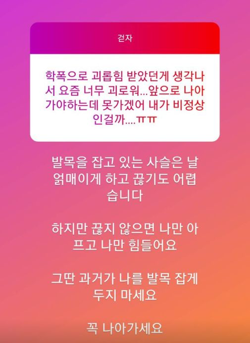 이날 한 누리꾼이 과거 학폭 피해 사실을 고백했다. 누리꾼은 “학폭으로 괴롭힘당했던 게 생각나서 요즘 너무 괴로워. 앞으로 나아가야 하는데 못 가겠어. 내가 비정상인 걸까”라고 밝혔다.