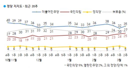 정당 지지도에선 민주당이 35%, 국민의힘 25%, 국민의당 5%, 정의당 5%를 기록했다. 무당층은 27%다. 전주 대비 민주당은 3%p, 국민의힘은 1%p 높아졌다.