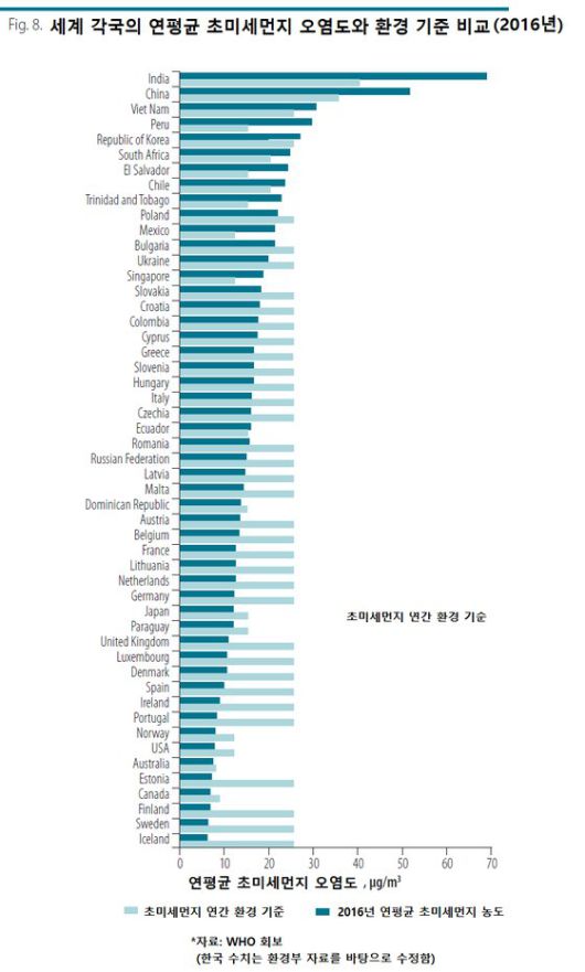 한국도 당시 연간 환경기준이 25㎍/㎥이었는데도, 2015~2016년 오염도가 26㎍/㎥여서 충족하지 못했다.