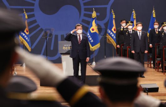 [이데일리 김영환 기자] 문재인 대통령은 12일 2021년 신임 경찰 경위·경감 임용식에 참석해 ‘국민중심 책임수사’를 강조했다.