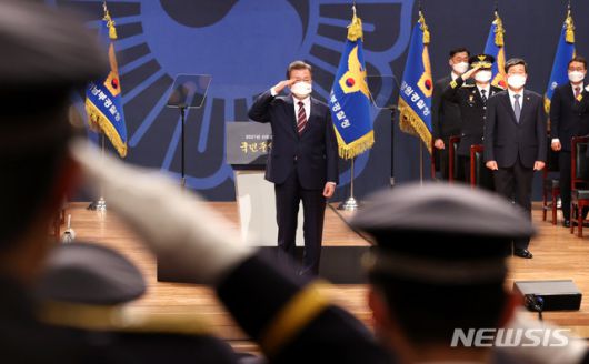 문 대통령은 "우리 경찰은 지난 4년, 5대 강력범죄는 물론 감염병을 틈탄 범죄가 우리 삶에 파고들지 못하도록