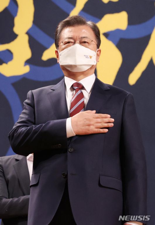 [아산=뉴시스]추상철 기자 = 문재인 대통령이 12일 오후 충남 아산시 경찰대학에서 열린 신임 경찰 경위·경감 임용식에 참석해 국민의례를 하고 있다. 왼쪽은 김창룡 경찰청장. 2021.03.12. scchoo@newsis.com |
