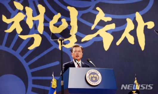 [아산=뉴시스]추상철 기자 = 문재인 대통령이 12일 오후 충남 아산시 경찰대학에서 열린 신임 경찰 경위·경감 임용식에 참석해 축사를 하고 있다. 2021.03.12. scchoo@newsis.com |
