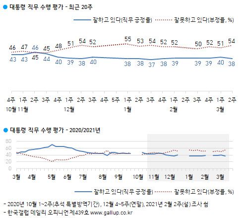 지난해 12월부터 큰 변화 없이 문 대통령에 대한 직무 긍정률은 30%대 후반에서 40% 사이, 부정률은 50%대에 머물고 있다.