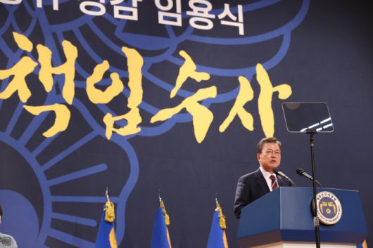 문재인 대통령이 12일 충남 아산시 경찰대학에서 열린 신임 경찰 경위·경감 임용식에 참석해 축사를 하고 있다. 연합뉴스 |