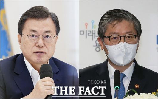 변창흠 국토교통부 장관(오른쪽)이 12일 LH 사태에 대한 책임을 지고 사의를 표명했다. 문재인 대통령(왼쪽)은 변 장관의 사의 표명에 대해 시한부 수용의 뜻을 밝혔다. /청와대, 국회사진취재단 제공 |