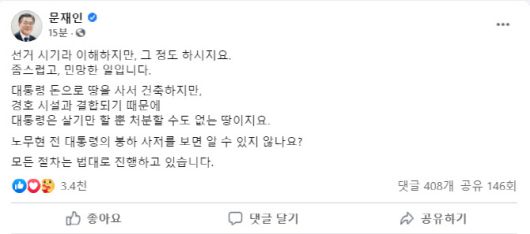 문 대통령은 “노무현 전 대통령의 봉하 사저를 보면 알 수 있지 않나요”라고 반문하면서 “모든 절차는 법대로 진행하고 있다”고 썼다.