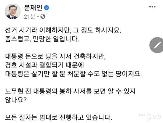 문 대통령은 이날 오후 자신의 페이스북 등 사회관계망서비스(SNS)에 "선거 시기라 이해하지만, 그 정도 하라"며 "좀스럽고, 민망한 일이다"고 밝혔다.