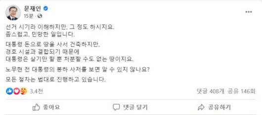 문 대통령은 이날 페이스북에 “선거 시기라 이해하지만, 그 정도 하시라. 대통령 돈으로 땅을 사서 건축하지만, 경호 시설과 결합되기 때문에 대통령은 살기만 할 뿐 처분할 수도 없는 땅이다”며 “모든 절차는 법 대로 진행하고 있다”며 의혹 제기에 대해 강한 불쾌감을 드러냈다.
