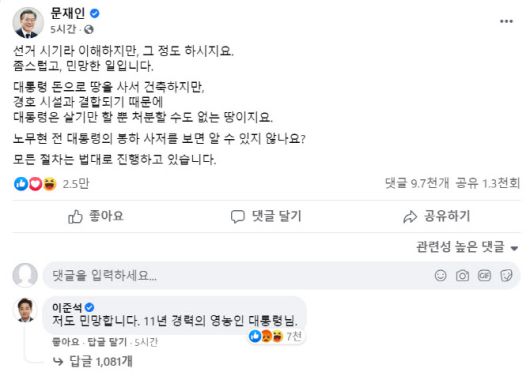 [이데일리 박지혜 기자] 문재인 대통령이 경남 양산시 사저 농지 매입 관련 야권에서 불법성을 지적하자 페이스북을 통해 직접 반박에 나섰다. 이에 이준석 전 미래통합당(국민의힘 전신) 최고위원이 댓글을 남겼다.