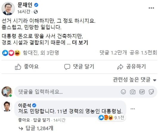 이준석 전 최고위원은 문 대통령의 페이스북 글에 직접 댓글을 달고 "저도 민망하다"며 "11년 경력의 영농인 대통령님"이라고 했다. 문 대통령이 해당 농지 취득 자격 증명서에 '영농 경력 11년'을 썼다는 것이다.