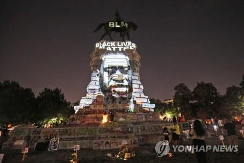 지난해 6월 8일(현지시간) 미국 버지니아주 리치먼드에 있는 남군 사령관 로버트 리 장군의 동상 기단부에 조지 플로이드의 얼굴이 투영돼 있다./사진 = 연합뉴스 |