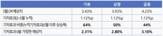 국금센터는 물가가 급등할 경우 4%를 넘어설 것으로 보고, 기본 시나리오상 미국의 5월 CPI 상승률을 3.4%, 예상보다 조금 높을 경우 3.9% 수준을 기록할 것으로 예상했다.