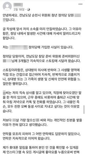 13일 정의당 전남도당 순천시위원회 소속 20대 청년당원인 A씨가 SNS에 공개한 글에 따르면 A씨는 2019년 10월부터 3개월간 지역위 간부 B씨에게 스토킹을 당했다고 밝혔다.