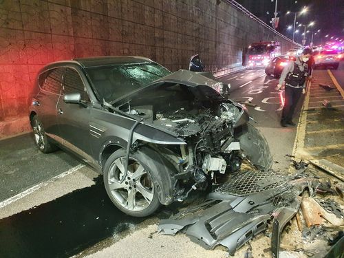 (부산=연합뉴스) 조정호 기자 = 14일 오전 2시 32분께 부산 남구 대연동 대남지하차도에서 30대 A씨가 몰던 제네시스 G80 승용차가 중앙 교각을 들이받았다.