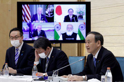 12일 화상으로 열린 회의에는 조 바이든 미국 대통령, 스가 총리, 나렌드라 모디 인도 총리, 스콧 모리슨 호주 총리가 참석했다.