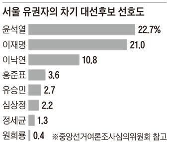 내년 대선의 잠재 후보들 중에서 서울 시민이 가장 선호하는 인물은 윤석열 전 검찰총장과 이재명 경기지사인 것으로 나타났다. 조선일보·TV조선이 칸타코리아에 의뢰해 서울 유권자 806명을 대상으로 13일 실시한 조사에서는 여야(與野) 잠재 후보 8명 중 ‘누가 대통령이 되는 것이 좋다고 생각하는가’란 질문을 던졌다. 그 결과 윤 전 총장(22.7%)과 이 지사(21.0%)의 선두 경쟁이 치열했다. 다음은 이낙연 전 더불어민주당 대표 10.8%, 홍준표 무소속 의원 3.6%, 유승민 전 국민의힘 의원 2.7%, 심상정 정의당 의원 2.2%, 정세균 국무총리 1.3%, 원희룡 제주지사 0.4% 등이었다.