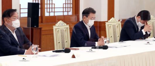 문재인 대통령이 지난 10일 청와대에서 열린 더불어민주당 원내대표단 초청 간담회에 참석해 있다. 왼쪽부터 김태년 당 대표 직무대행 겸 원내대표, 문 대통령, 김영진 원내수석부대표. /연합뉴스 |