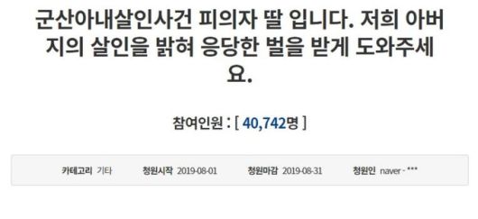 그즈음 청와대 국민청원 게시판에는 '군산아내살인사건 피의자 딸입니다. 저희 아버지의 살인을 밝혀 응당한 벌을 받게 도와주세요'라는 글이 올라왔다.