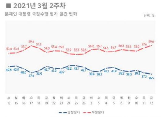 특히 긍정평가가 30%대로 주저앉은 것은 5주 만으로, 최근 쏟아지는 LH 투기 의혹에 영향을 받은 것으로 풀이된다.