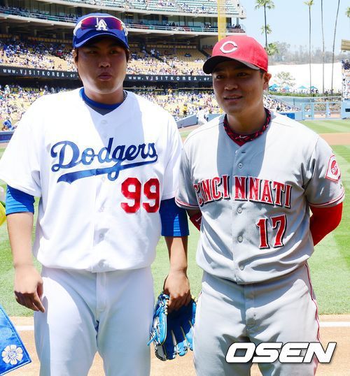 [OSEN=로스앤젤레스, 이대선 기자] 2013년 다저스타디움에서 류현진(왼쪽)과 추신수가 경기 전 기념촬영을 하고 있다. /sunday@osen.co.kr |