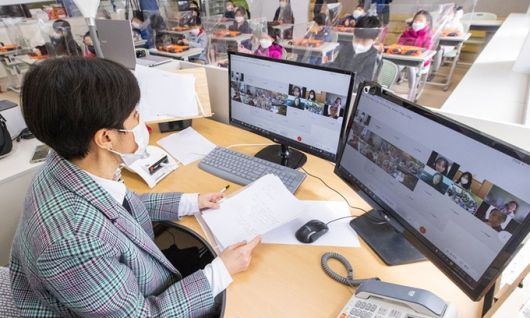 지난 2일 서울 한 초등학교서 1학년 담임교사가 온라인으로 학부모들에게 공지사항을 전달하고 있다. 연합뉴스 |
