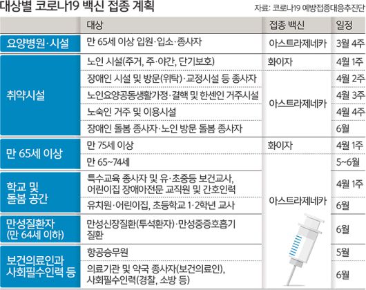 추진단은 학생들과 접촉이 많아 접종이 필요하다는 교육 당국의 건의에 따라 특수학교 교사와 종사자, 일반 학교 특수학급 교사, 유·초중등 보건교사, 어린이집 장애아전문 교직원과 간호인력, 어린이집·유치원 교사, 매일 등교하는 초등학교 1·2학년 교사 등의 접종 일정을 당초 3분기에서 2분기로 당겼다. 경찰·소방·군인 등 사회필수인력도 3분기에서 6월 일정으로 조정됐다. 군은 지휘통제실과 비무장지대 감시초소(GP) 등 전방, 격오지 부대 등부터 접종할 계획이다.