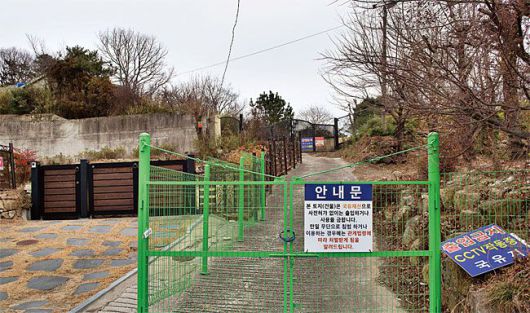 문재인 대통령이 퇴임 이후 머물 경남 양산시 하북면 지산리 평산마을 사저 부지로 올라가는 길 울타리에는 ‘본 토지는 국유재산으로 사전허가 없이는 출입을 금함’이라는 푯말이 붙어 있다./ 한준호 영상미디어 기자 |