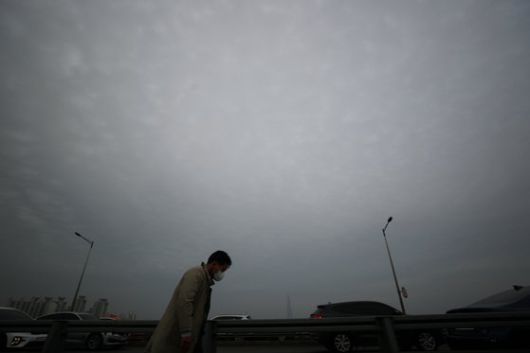 15일 황사가 덮친 중국 베이징. 한 시민이 베이징 시내에서 자전거를 타고 있다. AP |