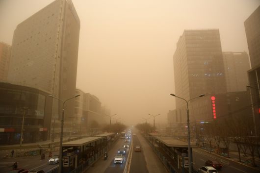 지난 15일 오전 중국 베이징(北京)의 도로와 건물들이 황사에 휩싸여 있다. 베이징시 기상대는 같은 날 올해 들어 처음으로 황사 황색경보를 발령했다. [연합] |