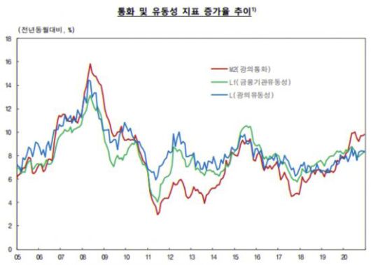 16일 한국은행에 따르면 지난해 연간 통화량(광의통화·M2)은 계절조정계열 평잔 기준으로 3070조8000억원을 기록, 3000조를 돌파했다. 직전해 대비 9.3%나 늘어난 수준이다. 지난해 월별 M2를 봐도 M2 증가율은 전년동월대비 상승세를 이어갔다. 작년 7월의 경우 전년동월비 M2 증가율이 10.0%에 달하기도 했고, 작년 말에도 9.8% 수준으로 높았다.