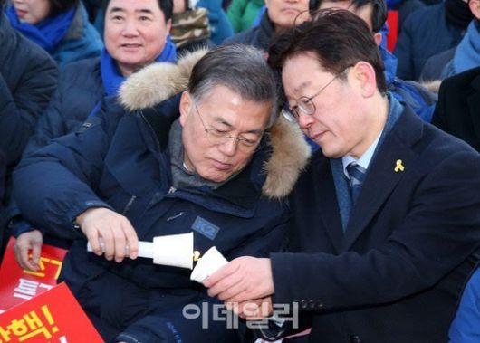 2017년 2월 11일 당시 문재인 더불어민주당 전 대표(왼쪽)와 이재명 성남시장이 11일 오후 서울 광화문에서 열린 15차 촛불집회에 참석하고 있다 (사진=이데일리DB) |