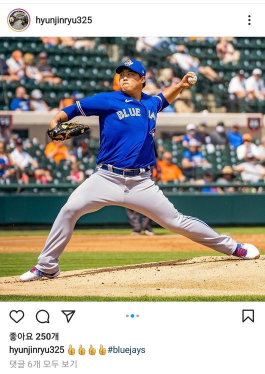 류현진은 자신의 인스타그램에 역동적인 투구 사진과 함께 엄지척 이모티콘 4개를 곁들였다. 자신의 투구 내용에 아주 만족한다는 의미였다. /what@osen.co.kr