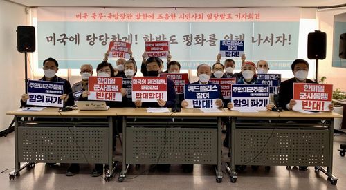 (서울=연합뉴스) 권영전 기자 = 6·15 공동선언실천 남측위원회와 민족화해협력범국민협의회가 한국의 분담금을 인상한 한미 방위비분담특별협정(SMA)을 파기해야 한다고 주장했다.