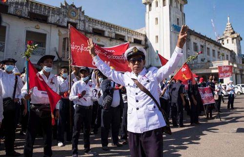 쿠데타 항의 시위에 참여한 미얀마 국영 철도 노동자들 |
