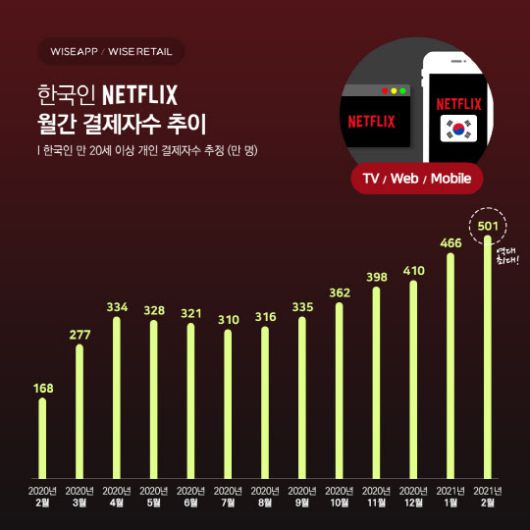 17일 앱·리테일 분석서비스 와이즈앱·와이즈리테일에 따르면 2월 한 달간 넷플릭스에서 결제된 금액은 725억원으로 역대 최대치를 기록했다. 작년 2월 결제금액 225억원에서 222% 증가한 수치다.