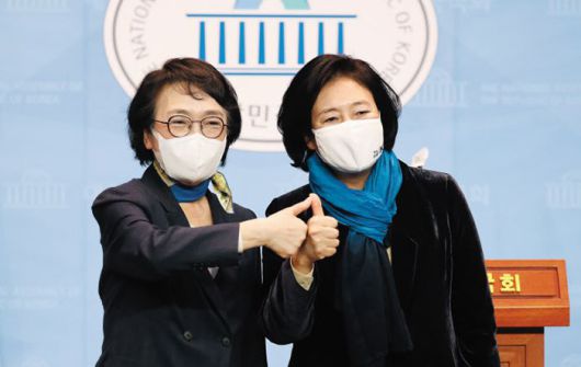 단일화 경선 승리한 박영선 - 더불어민주당 박영선(오른쪽) 서울시장 후보가 17일 국회 소통관에서 열린 김진애 열린민주당 후보와의 단일화 경선에서 승리한 뒤 함께 엄지손가락을 들어 보이고 있다. /국회사진기자단 |