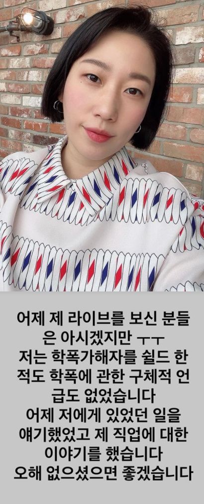 17일 김영희는 자신의 인스타그램에 "어제 제 라이브를 보신 분들은 아시겠지만 저는 학폭 가해자를 쉴드한 적도, 학폭에 관한 구체적 언급도 없었다"며 "어제 저에게 있었던 일을 얘기했었고 제 직업에 대한 이야기를 한 거다. 오해 없으셨으면 좋겠다"고 적었다.